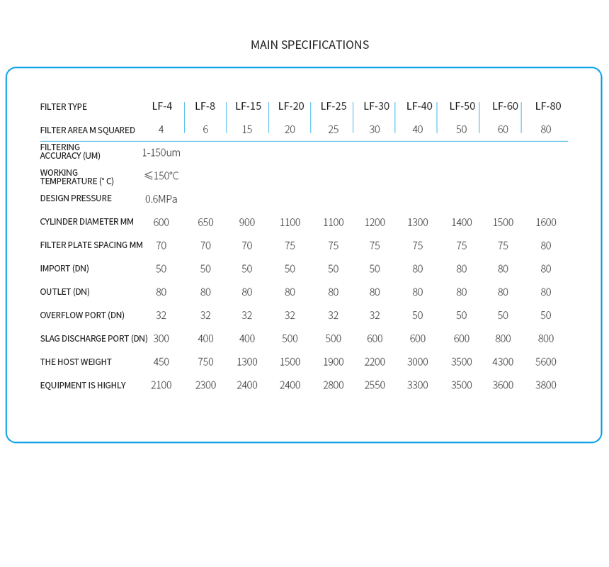 LF LF series vane filter (LF filter) is a kind of precision clarifying device with high efficiency, energy saving and automatic airtight filtration. More than internal integration of high-performance metal woven mesh, when the liquid through a filter, the filter outside surface gradually bypass offer solid substances in the liquid, when these solid material reaches a certain thickness is formed the so-called "filter cake layer", thus forming precision filtration.