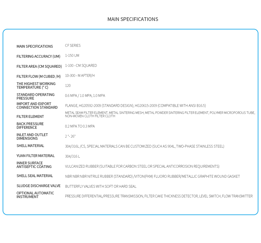 CF filter has a wide range of use, large filtration area, no strong ability, easy to reverse filter cake, automatic operation of prominent characteristics. CF filter has direct filtration, the precoat filters, slurry concentration, filter cake, filter cake washing five big functions, can be applied to high content of impurities, viscous liquid, high precision, high temperature and so on a variety of special filter occasions.