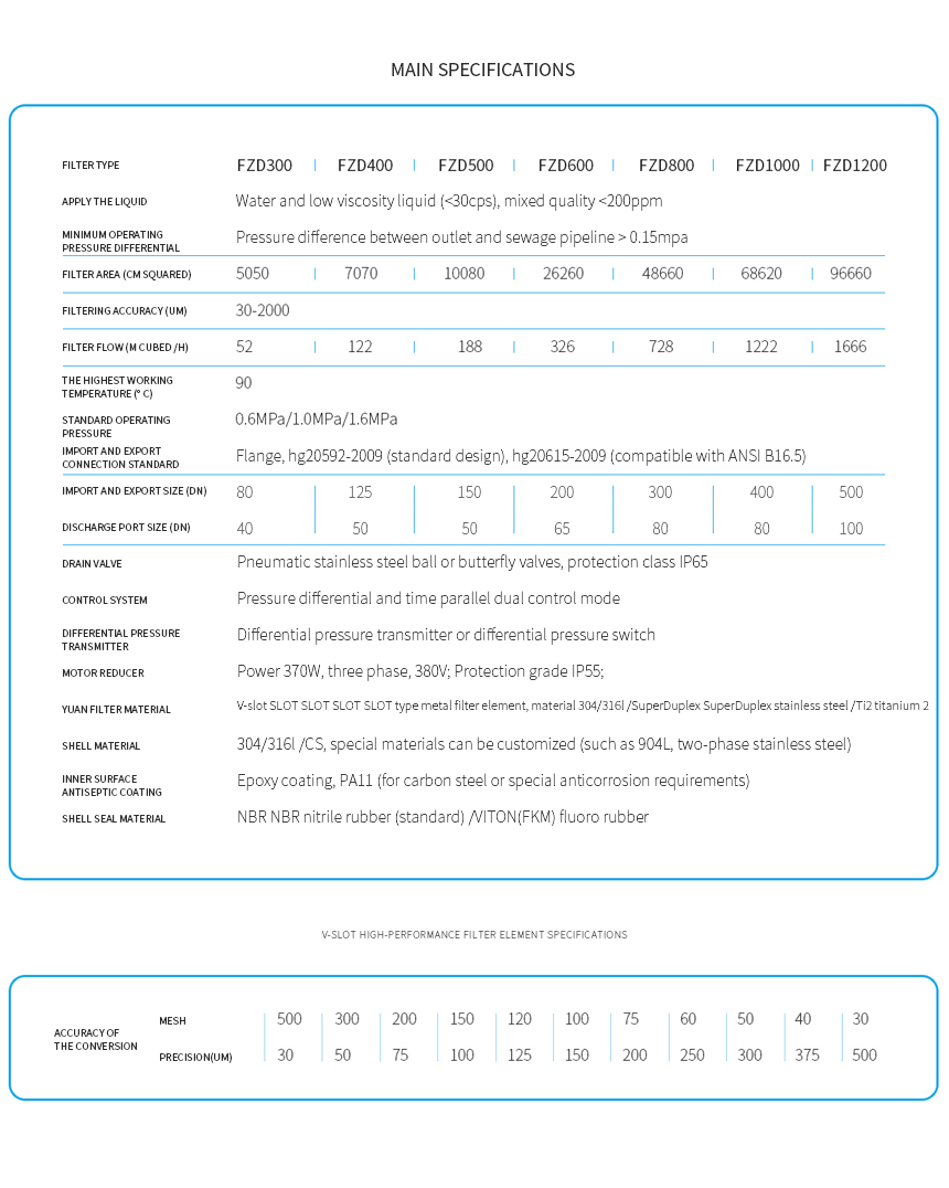 FZD filter to filter out all kinds of water and low viscosity liquid (such as sea water cooling water, machining) solid impurities, in order to meet the system operation and the process for liquid to the cleanliness requirements, also can be used to protect critical equipment downstream from particle plugging, wear, or scale, improving the efficiency of the key equipment and life. FZD filter is fully automatic on-line continuous filtration, which reduces the cost of shutdown, maintenance and human cost. It is an advanced solution for water and water-based liquid filtration.