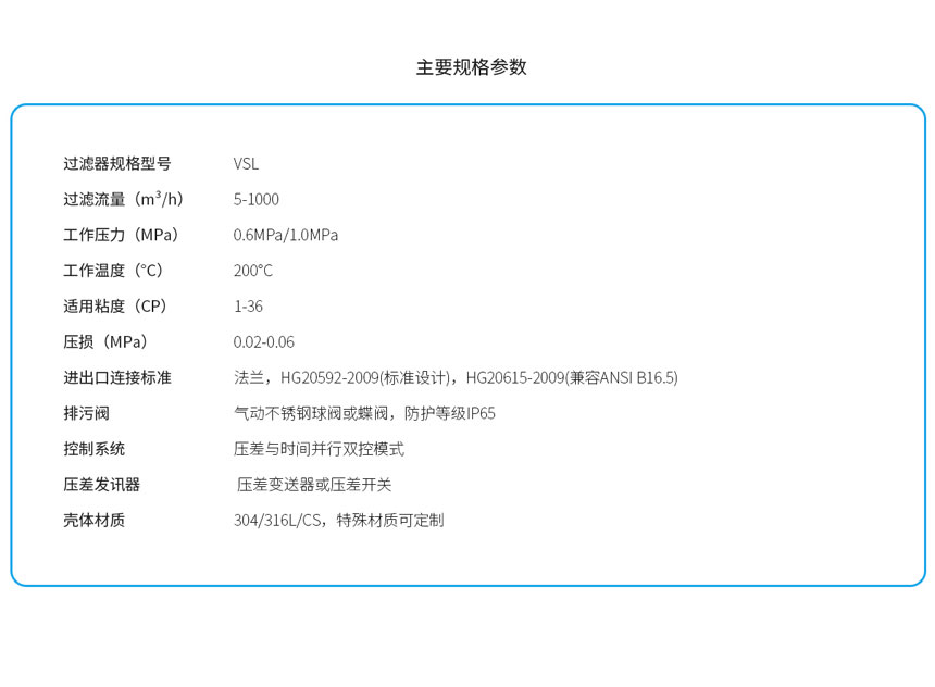 VSL過濾器的分離效率取決于液體中的微粒密度和液體粘度,微粒比重越大,粘度越低,分離效果越佳;對(duì)于大于40μm的大比重顆粒分離效率高達(dá)98%,可分離出最小5μm的固體雜質(zhì)。再采用自清洗過濾器、袋式過濾器、芯式過濾器等精密過濾,能獲得更佳過濾效果,降低濾材消耗及物料排放,形成整套過濾解決方案,分離效果更佳,運(yùn)行成本更低,物料浪費(fèi)更少。